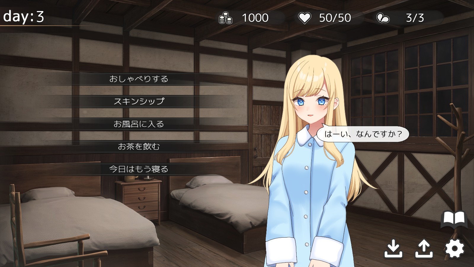 毎夜『おしゃべり』や『スキンシップ』で好感度と受容度を上げるシステム(『おしゃべり』で髪型も変えられる)。日々の生活は単調ですがプレイ時間も短かく、作業感で辛くなる前にクリアできるのはありがたいです。