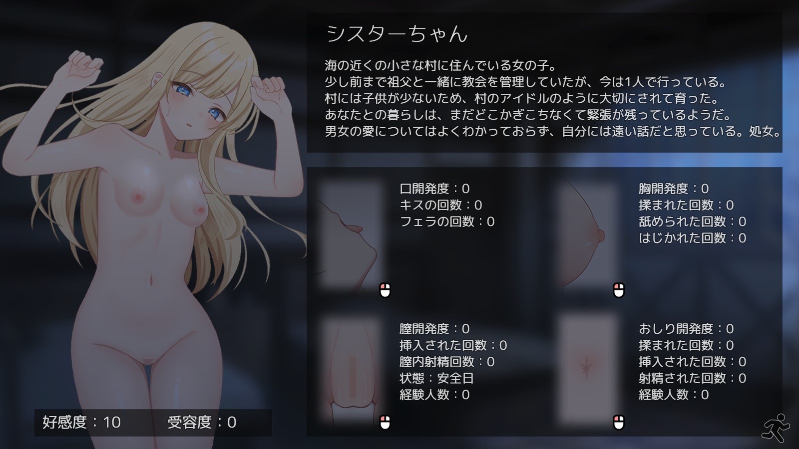 おさわりできる部分は頭、口、胸+乳首、膣、尻と欲しい部位が揃ってます。私は乳首フェチなので揉むだけではなく、乳首がプリプリできるのが嬉しかったです。あ、シスターちゃんのパジャマは右クリックで脱がせます(ここ盲点だった方もいるのでは?/私だ)