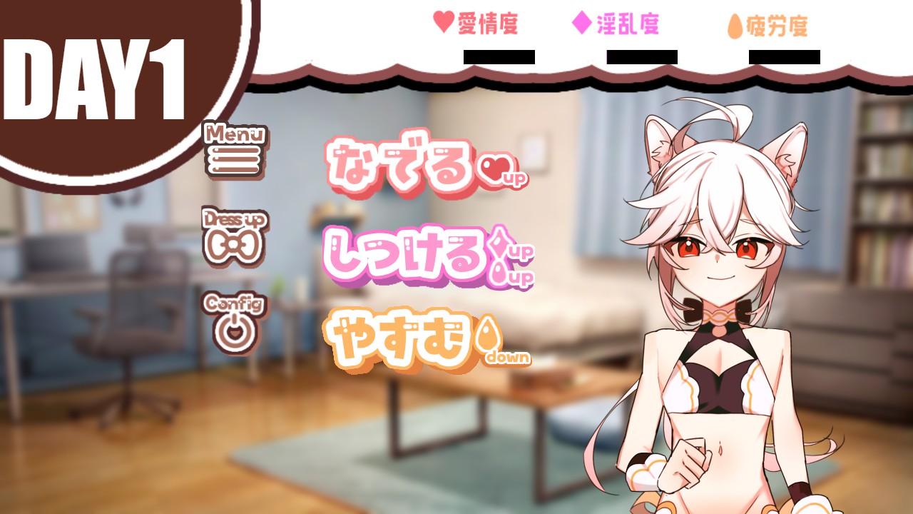 本作は手軽に遊べる育成SLGで、1日に選べるコマンドは「なでる/しつける/やすむ」の3つだけ。選んだ行動でステータスが上昇していく、シンプルで分かりやすい育成システムになっています。期間は10日間と短めですが、そのぶん日常やHイベントがテンポよく発生し、密度の高い同棲生活を味わえるのも魅力。