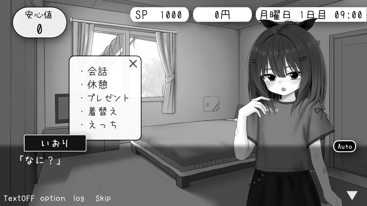 コミュニケーションは『会話、休憩(スキンシップ)、プレゼント、えっち』。ただし会話だとSPしか上がらず、安心度はプレゼントや夕食、イベントで上昇します。ちなみに夕食は毎日与えることになり、特大の安心度が稼げますが実は食べさせなくても問題なし。「まさか餓死しないよね…」とドキドキしましたが約50日間を無事に生き残りました(笑)